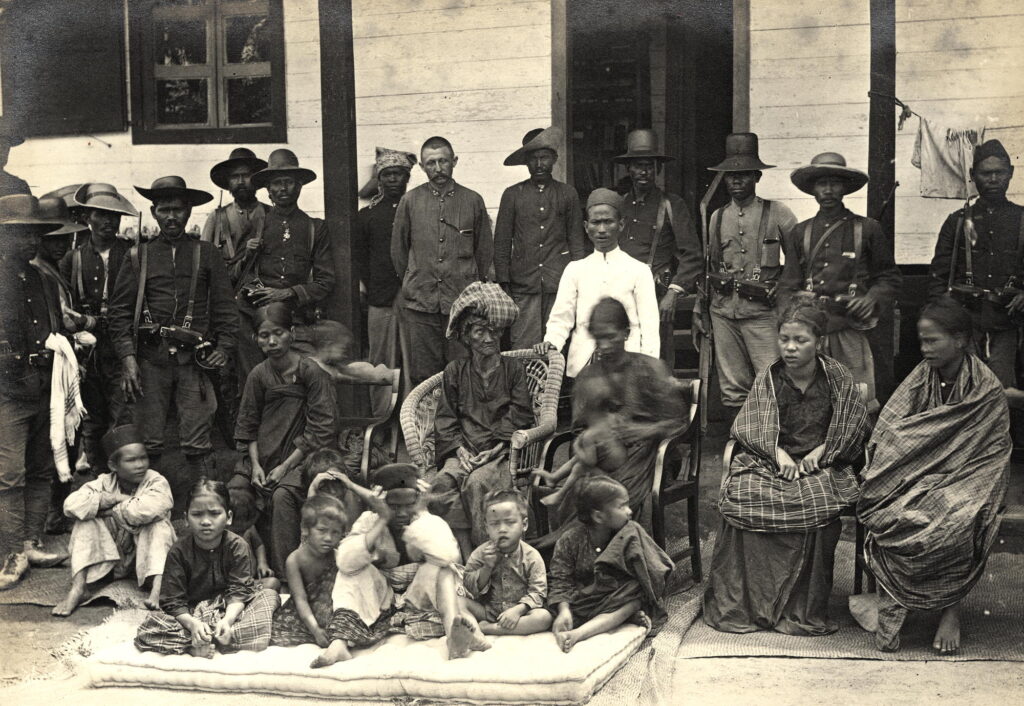 Keterangan untuk foto: Pada tahun 1907, keluarga Singamangaraja ditangkap dan dibawa ke Siborongborong. Sebuah foto yang diambil di pasanggrahan Siborongborong memperlihatkan sejumlah anggotanya: dari kiri tampak Boru Nadeak (istri kedua) menggendong seorang anak—kemungkinan Pangarandang—disusul Boru Situmorang (ibu), serta Boru Sagala (istri pertama) dengan seorang anak di pangkuannya yang diduga Raja Barita. Di belakang mereka, berdiri mengenakan pakaian putih, terlihat Ama ni Pulo Batu, kemenakan Singamangaraja. Enam anak yang duduk di bagian depan kemungkinan mencakup Himpang, Saulina, Buntal, Sabidan, dan Pangkilim, yang saat itu masih berusia kanak-kanak, sementara perempuan yang berada paling kanan diduga Sahudat. Di latar belakang tampak beberapa anggota pasukan marsose, termasuk seorang perwira bawahan tanpa tutup kepala.