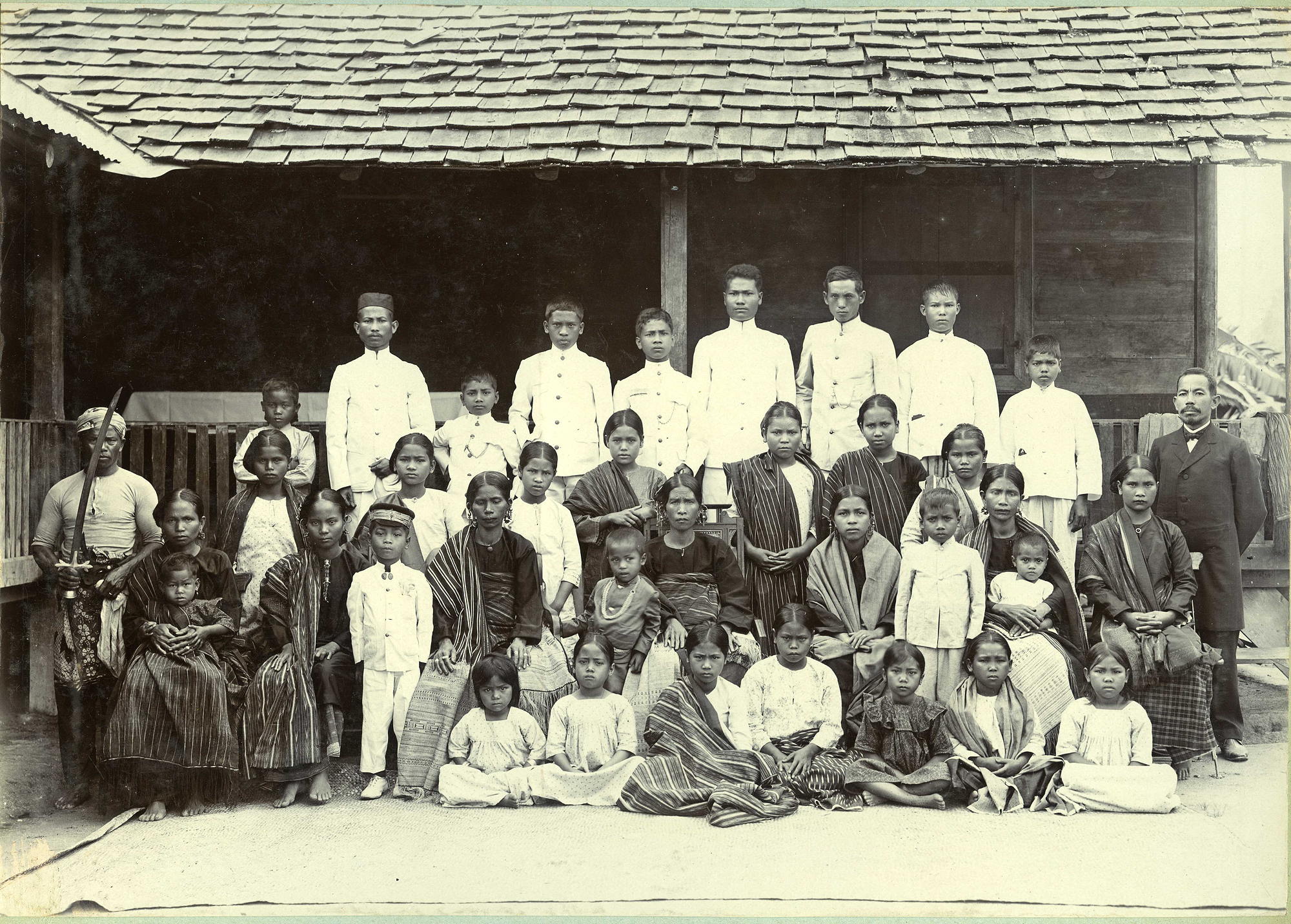 Keterangan untuk foto: Pada tahun 1907, keluarga Singamangaraja ditangkap dan dibawa ke Siborongborong. Sebuah foto yang diambil di pasanggrahan Siborongborong memperlihatkan sejumlah anggotanya: dari kiri tampak Boru Nadeak (istri kedua) menggendong seorang anak—kemungkinan Pangarandang—disusul Boru Situmorang (ibu), serta Boru Sagala (istri pertama) dengan seorang anak di pangkuannya yang diduga Raja Barita. Di belakang mereka, berdiri mengenakan pakaian putih, terlihat Ama ni Pulo Batu, kemenakan Singamangaraja. Enam anak yang duduk di bagian depan kemungkinan mencakup Himpang, Saulina, Buntal, Sabidan, dan Pangkilim, yang saat itu masih berusia kanak-kanak, sementara perempuan yang berada paling kanan diduga Sahudat. Di latar belakang tampak beberapa anggota pasukan marsose, termasuk seorang perwira bawahan tanpa tutup kepala.